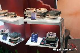 Noctua was back at the show this year promoting some old heatsink products as well as some extremely new prototype designs. One of the most interesting coolers they had on display was this single tower unit with 7 heatpipes running across the processor.