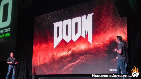 The video starts off running at 1080p (which is the limit of the projector being used) with V-Sync enabled, and the frame rate is a steady 60 fps. After a minute or so, they shut off V-Sync and you'll see performance jump into the 120-200 fps range. id says there are still a few graphical glitches they're working to fix, specifically when the game hits 200 fps. Apparently there are some bugs in the game engine at 200 fps that they "weren't able to detect until they had the performance of the GTX 1080."