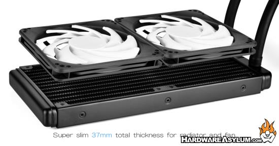 HardOCP is looking at the "slim" version of this cooler which features a much thinner radiator, 15mm thick fans and slightly redesigned internals. The loss in water volume will have an impact on overall heat capacity but the large dual 120mm radiator makes up for some of that.