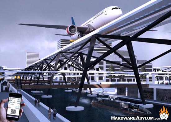 Alex Sutton, a grad student from Bartlett School of Architecture in London, seems to have thrown all logic to the wind and decided to experiment with a new style of airport that isn't on the ground and far from the city but rather elevated and placed in the empty space between buildings. On paper this looks like a good use of "empty space" however creates a whole list of problems including (but not limited to) excessive noise, wind, broken windows, plane crashes and let’s not forget that once you cover a street with a runway that street no longer gets any light.