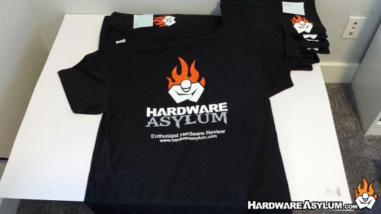 You will find the large Hardware Asylum logo and web address on the back and a smaller version of the flame guy on the front left chest.