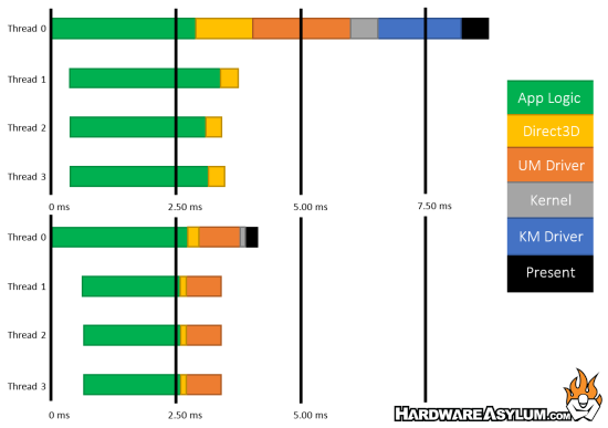 If you’re a gamer, you know what 3DMark is – a great way to do game performance benchmarking on all your hardware and devices. This makes it an excellent choice for verifying the performance improvements that Direct3D 12 will bring to games. 3DMark on Direct3D 11 uses multi-threading extensively, however due to a combination of runtime and driver overhead, there is still significant idle time on each core. After porting the benchmark to use Direct3D 12, we see two major improvements – a 50% improvement in CPU utilization, and better distribution of work among threads.