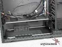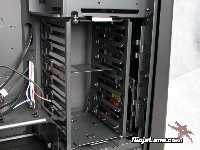 The hard drive cage is rather unique but on the surface it seems very typical. The cage features spots for up to 7 devices with each one held in place with a combination of screws and plastic clips. The unique part is that for once you can position the harddrive rack in one of 2 different orientations. The default installation has the drives facing sidesways but you can reposition the cage and have the drives facing towards the front.