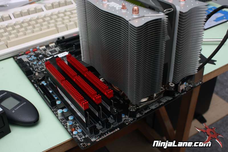 Installing the heatsink can be a little tricky, and due to the overall size will require a few trial fits to get correct. We choose the vertical placement since the horizontal position was in conflict with our Dominator GT memory.