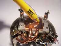 The MeOrb is comprised of dual 6mm copper heatpipes arraigned in a circle to completely wrap around the cooling fan. This provides the greatest surface area while still remaining extremely compact. The radiator is made from stamped aluminum with 92 fins in the outer circle and 69 fins in the inner circle. You will notice the fins are not arranged in a complete circle but actually the outer fins only cover about a 250 degree sweep allowing clearance for Northbridge or PWM cooling solutions.