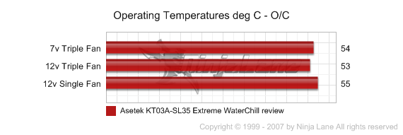 With just about every cooling system there are limits to how much heat it can consume and dissipate. The single fan option had the highest temp, as expected, and the triple fan version running at 12v had the lowest temp. However given the variance and inaccuracies outlined above it is pretty safe to say that the asetek KT03A is dissipating all it can but we couldn't pump enough heat in to really make a difference. From an enthusiast standpoint this exactly what you need from a high-end watercooler.