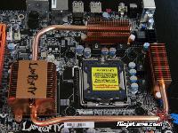 Let’s look at the heatsink a little. DFI has changed the motherboard cooling option on the DFI LP DK X48-T2RS over the older DK X38 board. This time the heatsink is installed and ready to go. They are using an all copper heatpipe assembly that runs around the whole socket area. No more attaching a heatsink for us on this one.