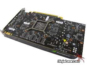 Backside of the GTX550Ti shows the true differences between this and the GTS450. For starters you will notice the black PCB and apparent lack of additional memory chips.